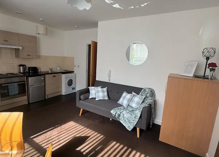 Gasten kunnen gebruikmaken van een ingerichte kitchenette in 1-slaapkamer Chic Trafford Apartment, Private Underground Parking, Fast Wi-Fi, Self Check-In Anytime, 5 Mins To Old Trafford Stadium om een lekkere zelfgemaakte maaltijd in elkaar te flansen. Chester Road/Warwick Road bushalte is in de buurt van dit 1-badkamer appartement.